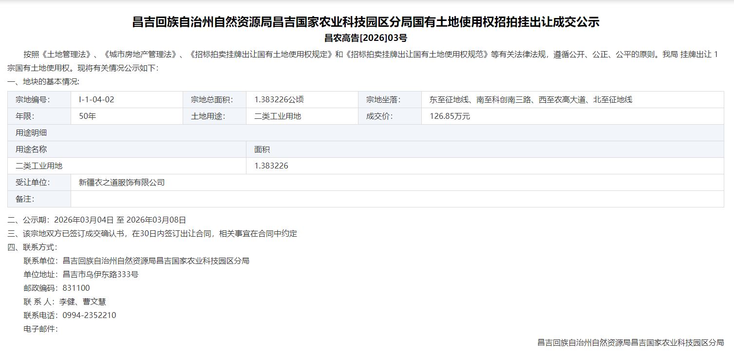 昌吉回族自治州自然资源局昌吉国家农业科技园区分局国有土地使用权挂牌出让公告成交公示