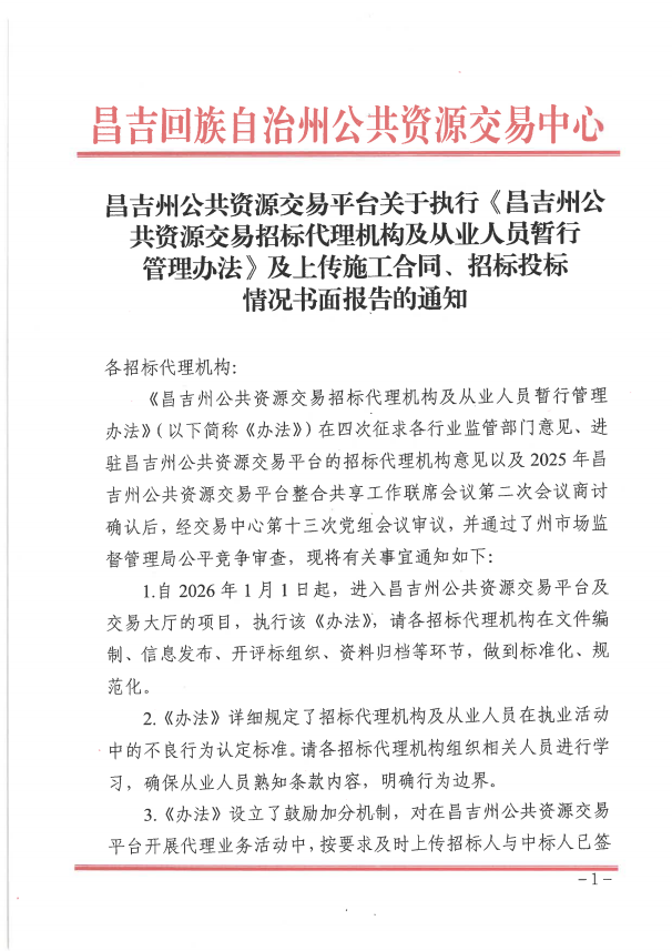 昌吉州公共资源交易平台关于执行《昌吉州公共资源交易招标代理机构及从业人员暂行管理办法》及上传施工合同、招标投标情况书面报告的通知